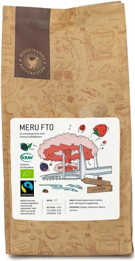 Bergstrands Kafferosteri Meru is a 100 % Fairtrade-certified coffee blend, which creates a berry-like and fragrant taste explosion.