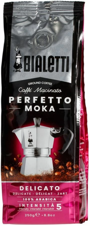 Bialetti Perfetto Moka Delicato is an Italian medium roast ground espresso coffee. 100 % Arabica from Brazil, delicate, with the highlighted notes of hazelnut and dried fruits.