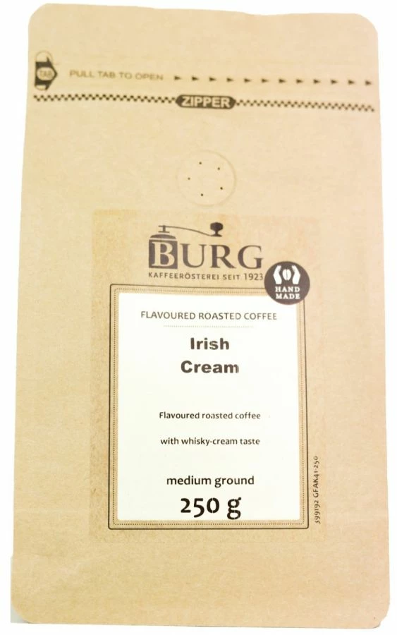 Burg flavoured coffee with a fine and mild Irish Cream taste in a blend of the finest hand-processed 100 % Arabica coffee beans. Also try as refreshing cold brew coffee!