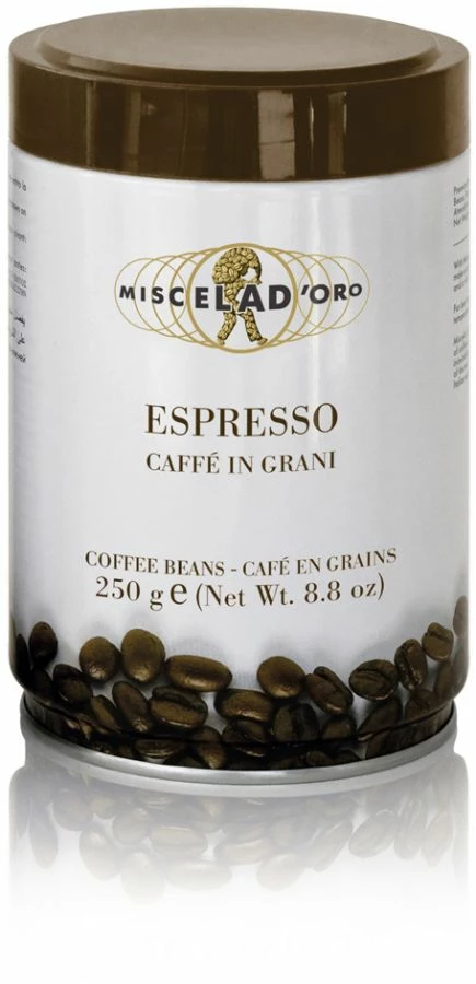 Miscela d’Oro Espresso is available in 250 g tins both as whole coffee beans as well as ground coffee. The ground coffee is best suited for moka pots.