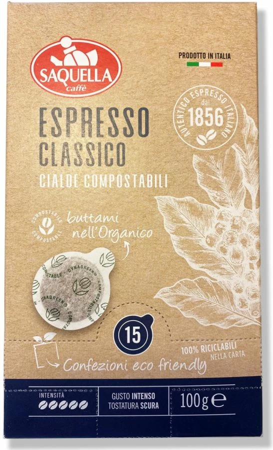 Saquella Classico E.S.E. espresso coffee pods – A creamy coffee with an intense taste and lasting aroma according to the Italian tradition of espresso coffee. Deep and satisfying aftertaste. 15 pcs espresso pods in a box.
